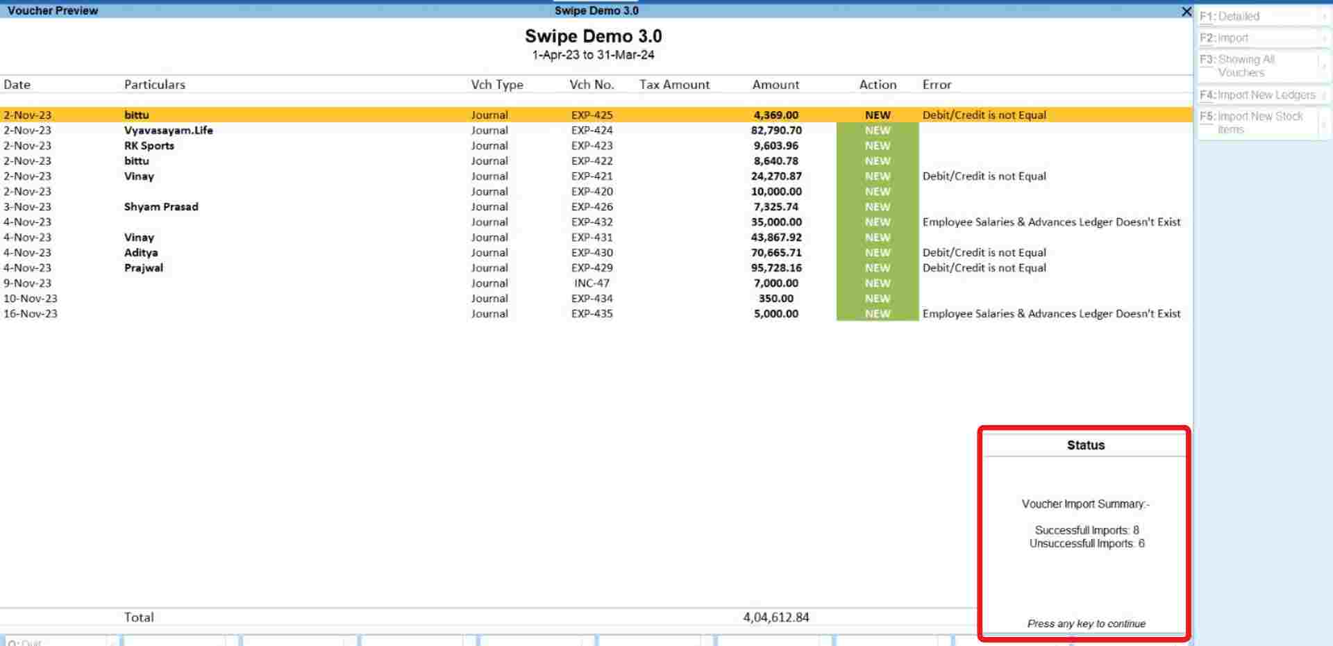 Congratulations! You have successfully imported new ledgers and a pop-up appears at the bottom of the screen informing the screen. Press any key to continue.