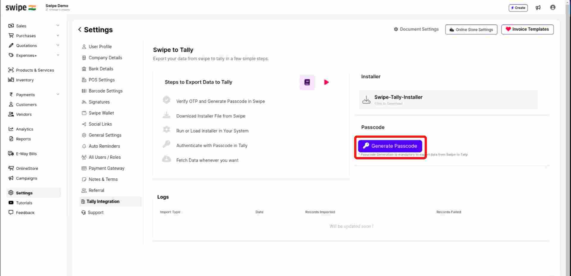 Click on the “Settings” icon on the left dashboard and select the “Tally integration” option from the menu.