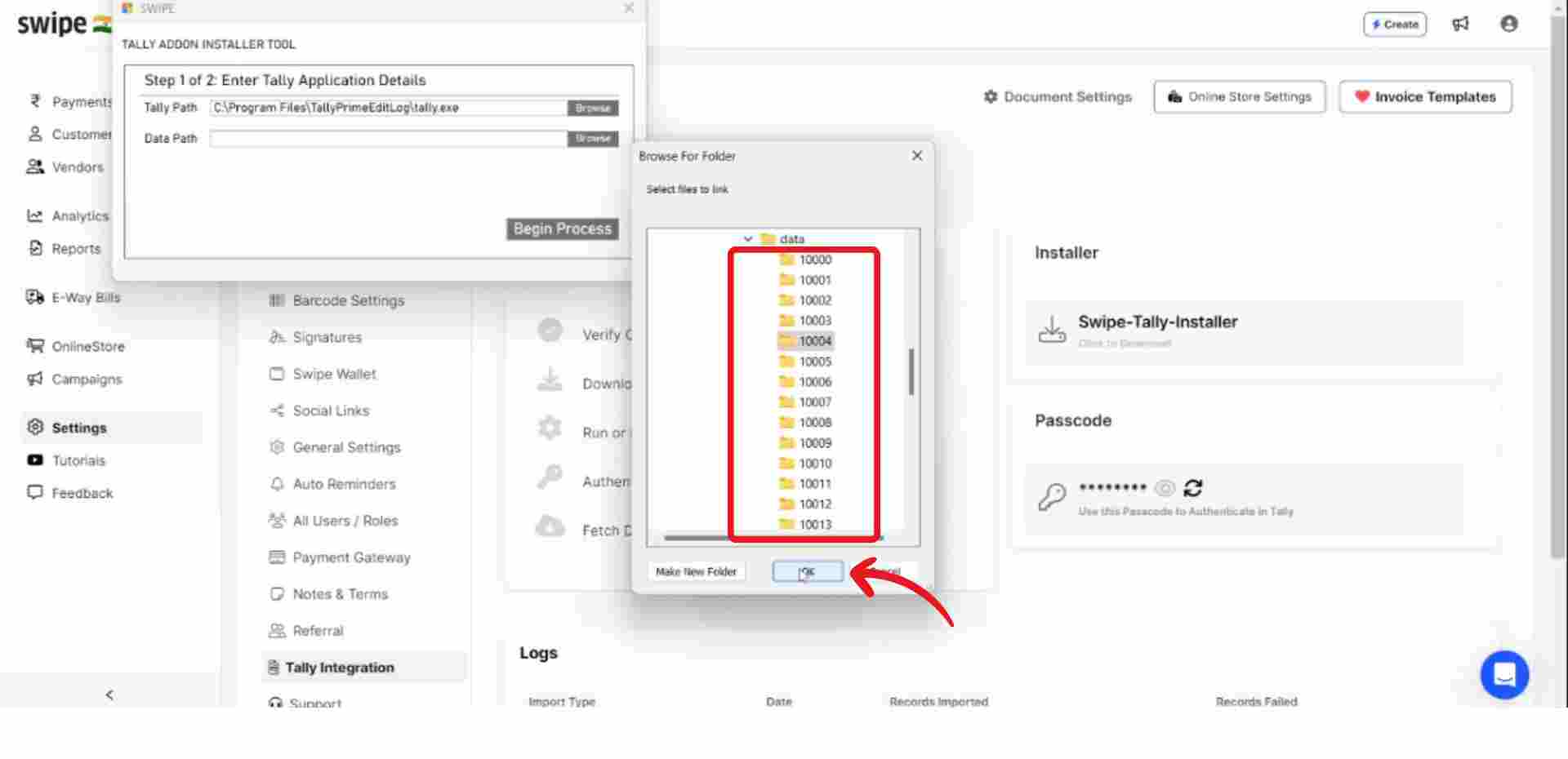 Click on "Browse" next to Tally Path; your file explorer will open. Here, locate and select the Tally file on your device, then click "Open."