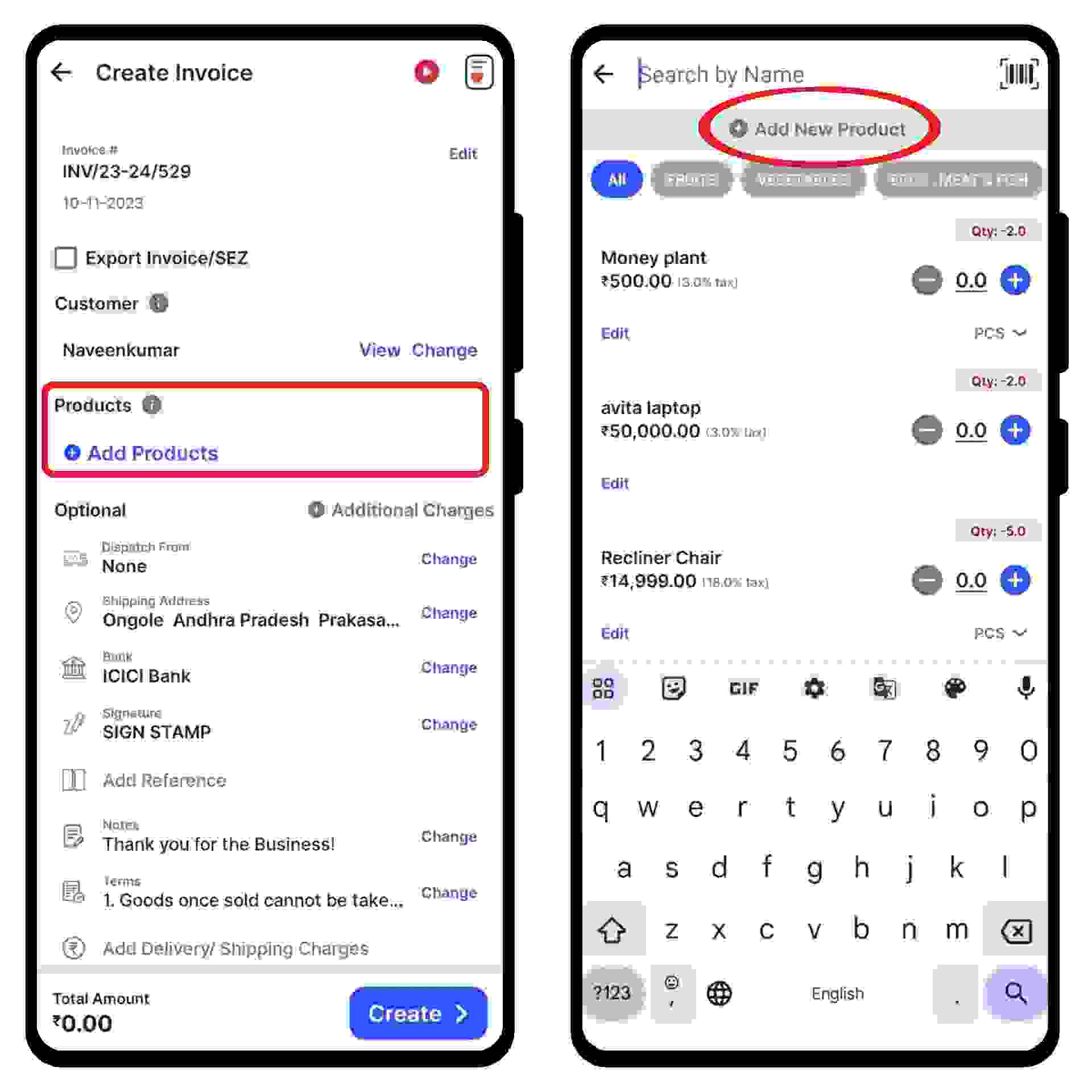 Click on “Add Products” and select/ search for the product you would like to add. Now click on “+” to add the quantity of the product.