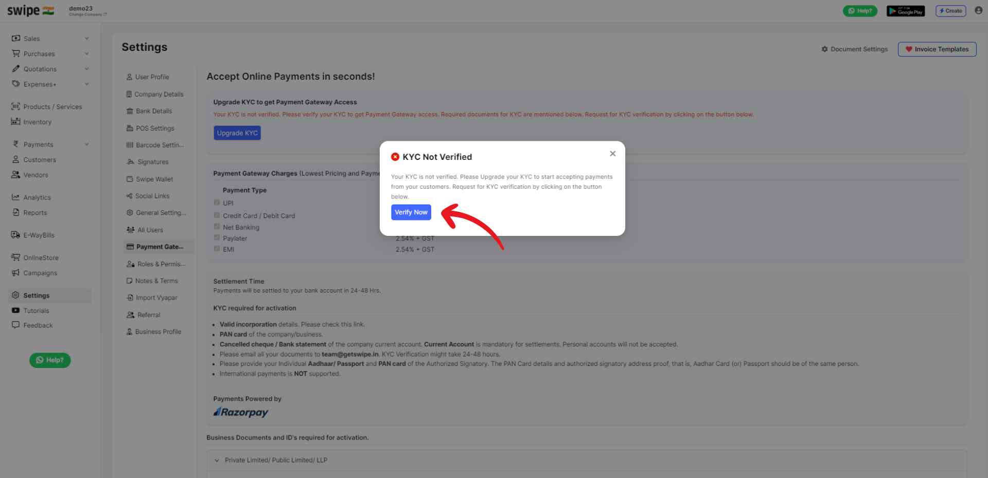 Once your KYC verification is complete, you will receive a confirmation from Swipe confirming that your KYC has been verified. You can now start using the payment gateway for transactions. You will also find a "Pay Now" button at your invoices, allowing you to easily and securely make payments.